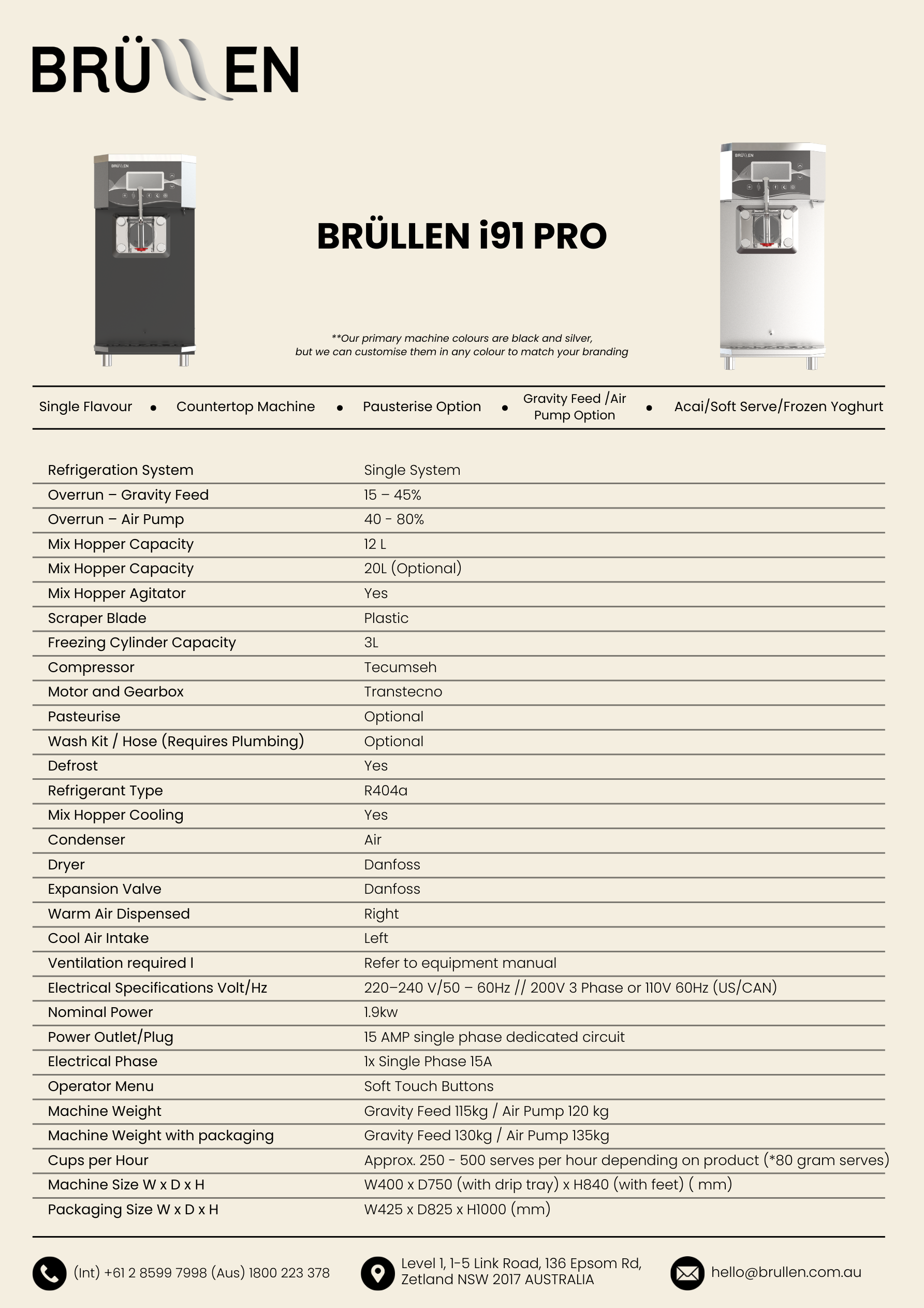 Voltage: 220–240 V/50 – 60Hz // 200V 3 Phase or 110V 60Hz (US/CAN)